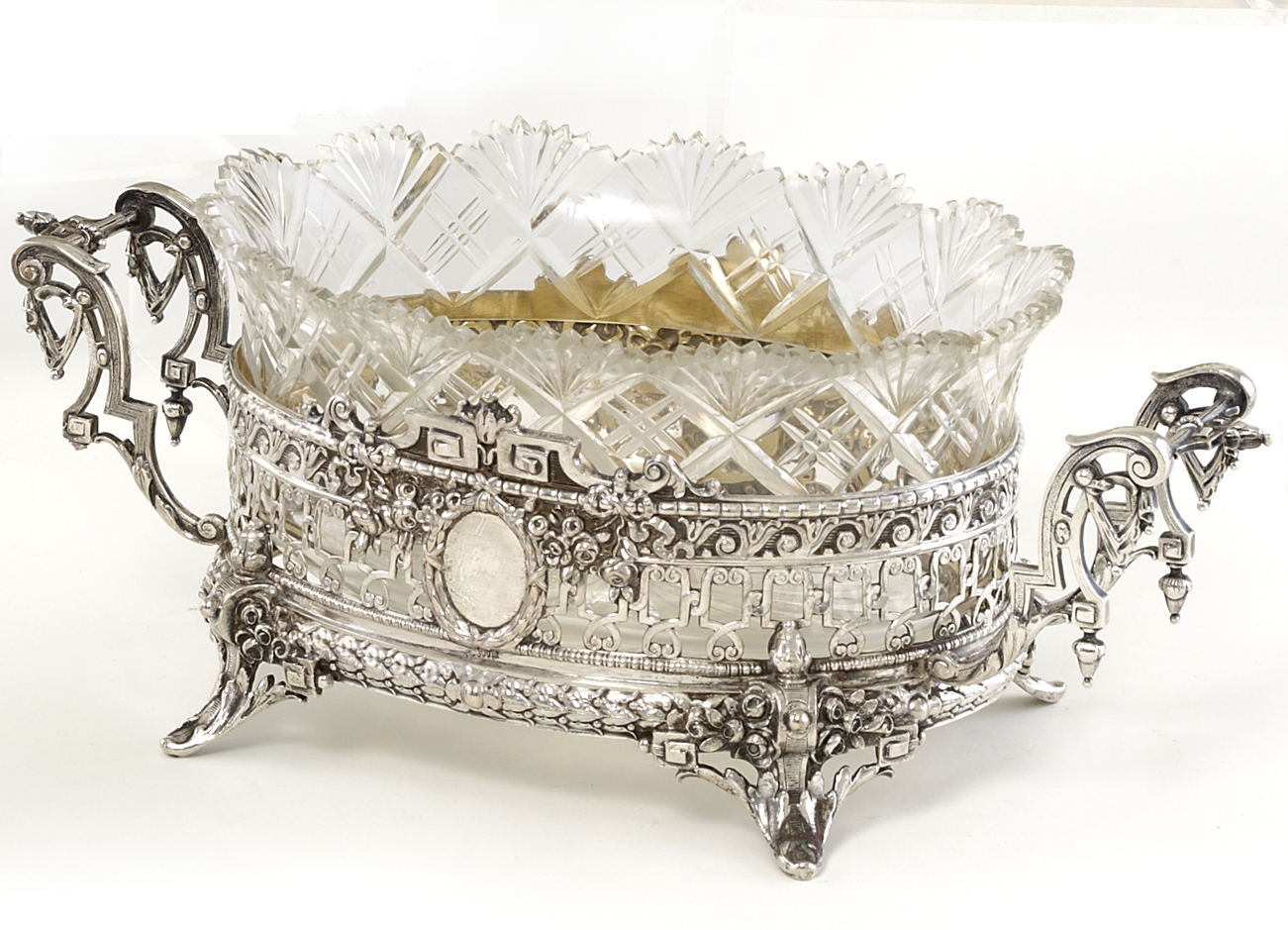 Silber mit Innenvergoldung. Kristallglaseinsatz mit Schnittdekor. Ca.380g. Höhe 9cm, Länge 28cm.