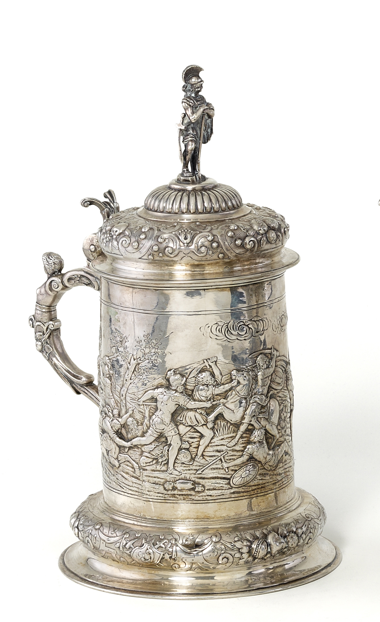 umlaufend antikisierende Kampfszene auf freiem Feld. Der gewölbte Scharnierdeckel durch