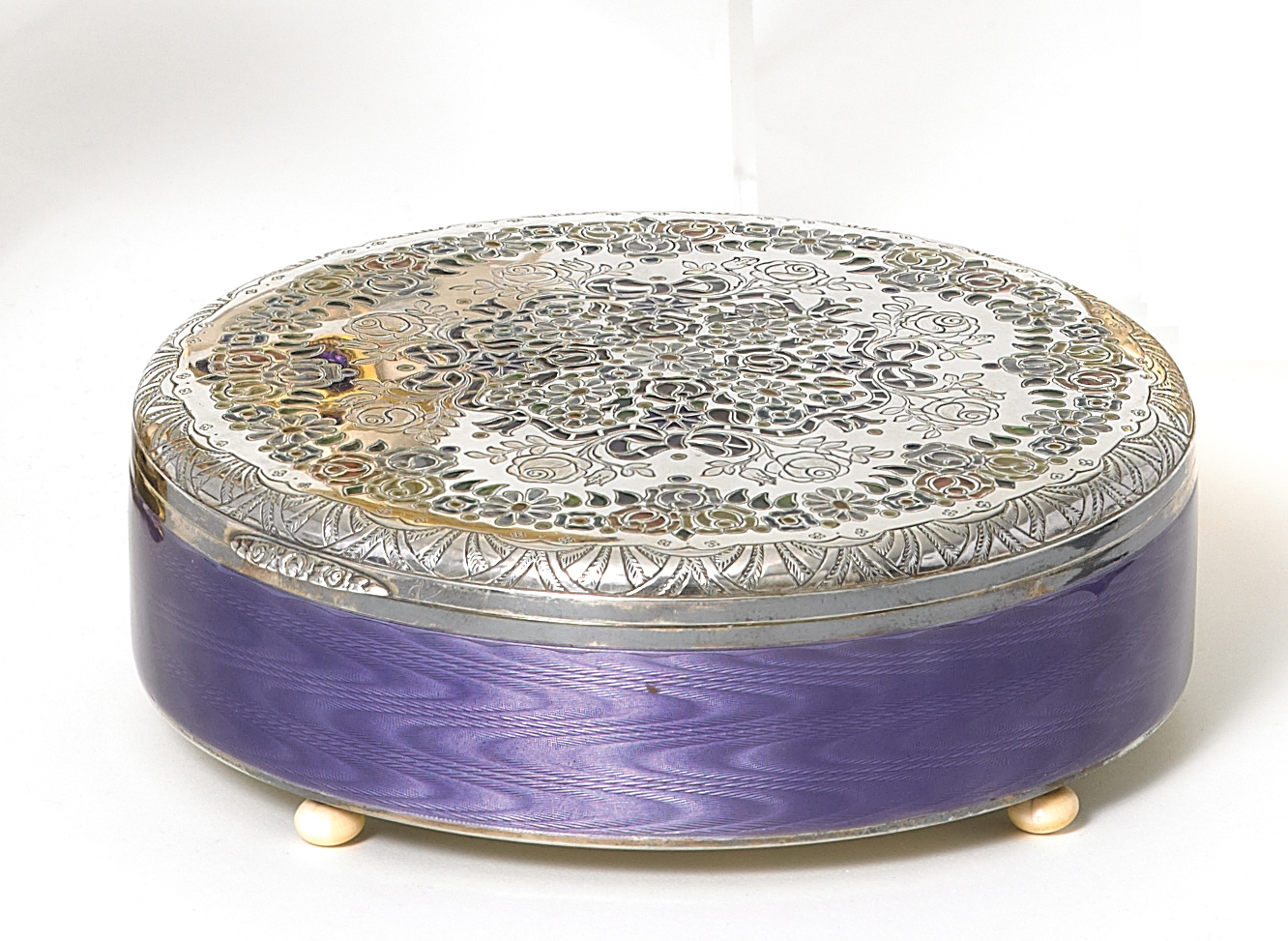 Silber mit Innenvergoldung. Farbiges transluzides Email. Auf kleinen Kugelfüßen flacher zylindrischer Korpus mit scharniertem Deckel. Dieser reich
