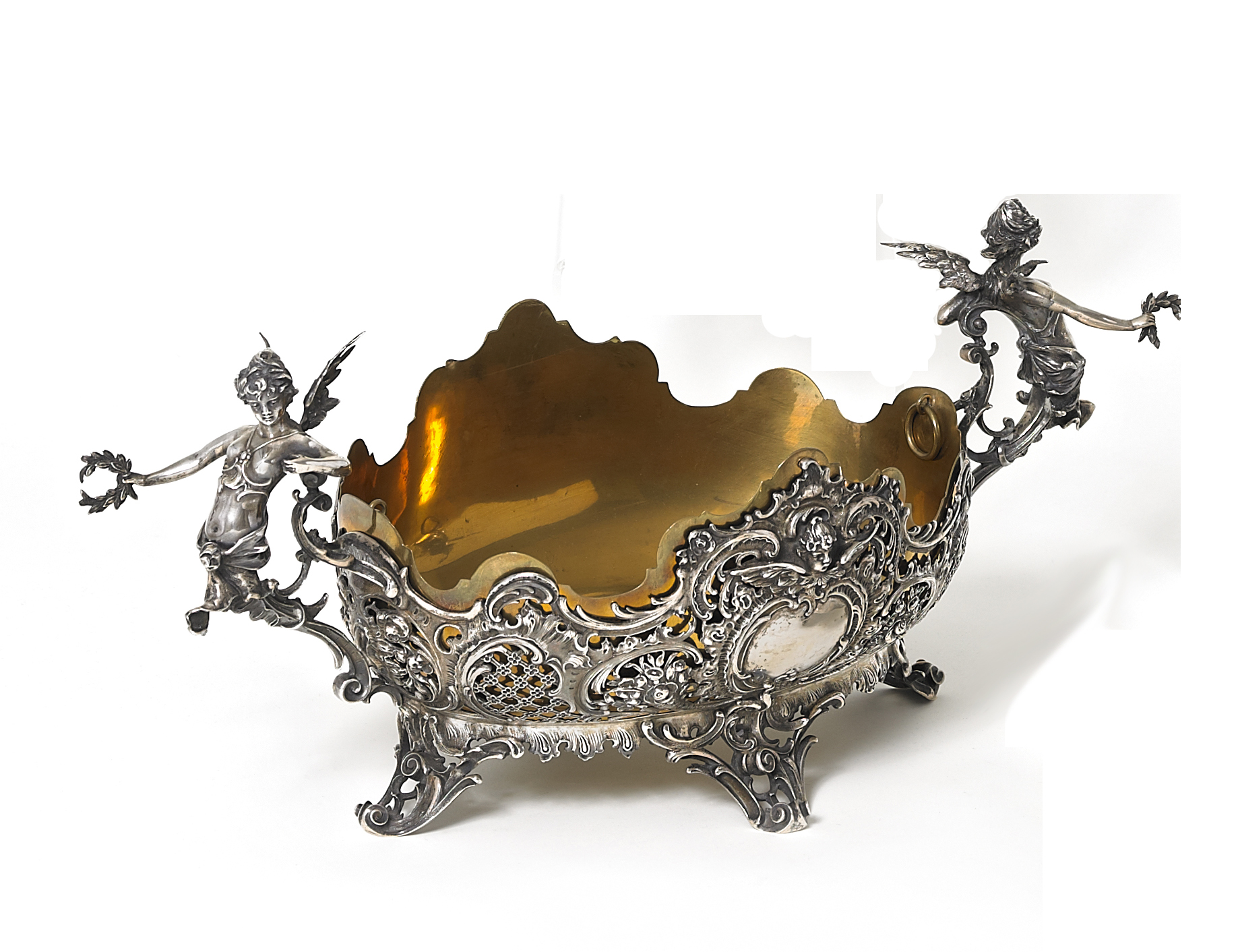 Silber mit Innenvergoldung. Messingeinsatz. Auf vier Rocaillefüßen ovaler, reich durchbrochen gearbeiteter Korpus. Die seitlichen