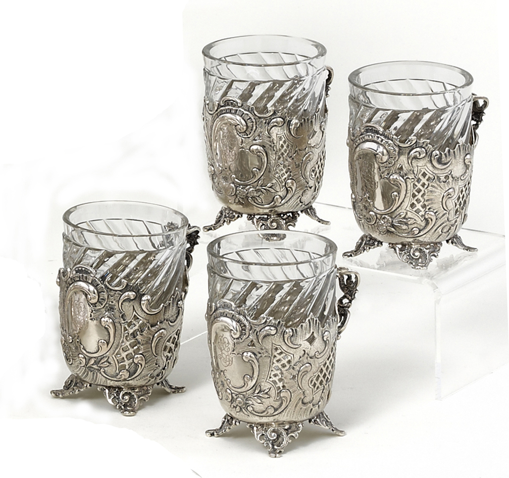 FOLGE VON VIER TEEGLASHALTERN MIT ROCAILLENDEKOR