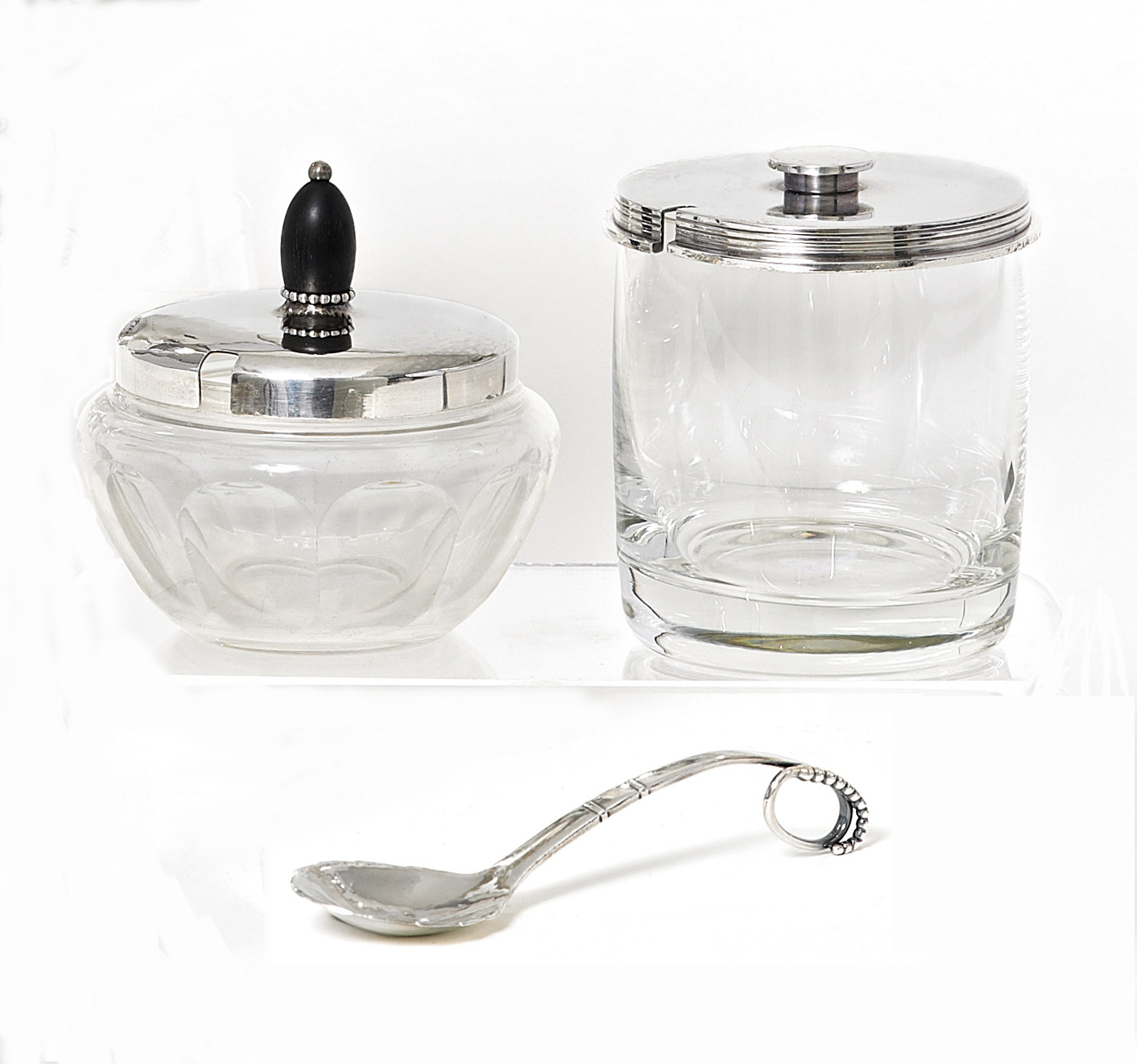 a) Denmark, Sterling, Firmenmarke Georg Jensen nach 1945, Modell-Nr. 710, Entwerfersignet Sigvard Bernadotte. b) Denmark, Sterling, Firmenmarke Georg Jensen nach 1945, Modell-Nr. 80. c) Denmark, Sterling, Georg Jensen, Nr. 41. Zustand A/B. Ein Glaskorpus leicht milchig.