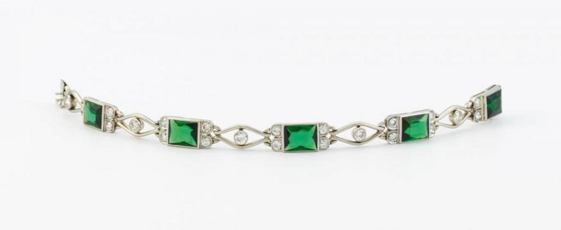 585/- Weißgold, Gewicht: 21,2g. L x B=ca. 17,5 x 0,8cm. 25 Brillanten zus.ca. 2,65ct TW-W(G-H) VS-SI, 5 facettierte Turmaline im Baguetteschliff zus.ca. 10,0ct.