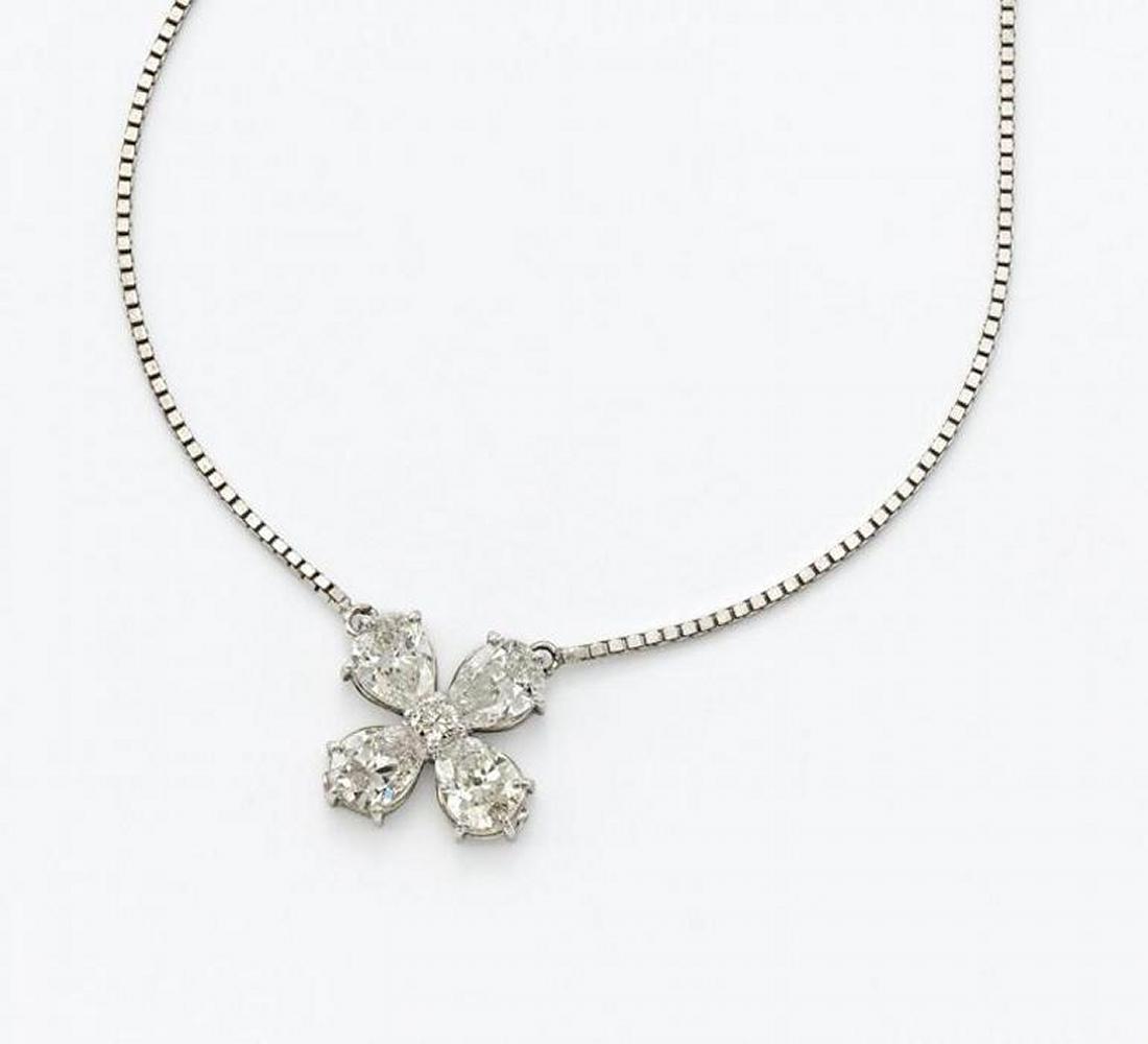Anhänger: 950/- Platin, Kette: 750/- Weißgold, Gewicht: Total: 7,7g. L.ca. 36,0 und 42,0cm. 4 Diamant-Tropfen zus.ca. 2,80ct W-Cr(H-J) VVS-VS, 1 Brillant ca. 0,125ct Cape (M) VVS.