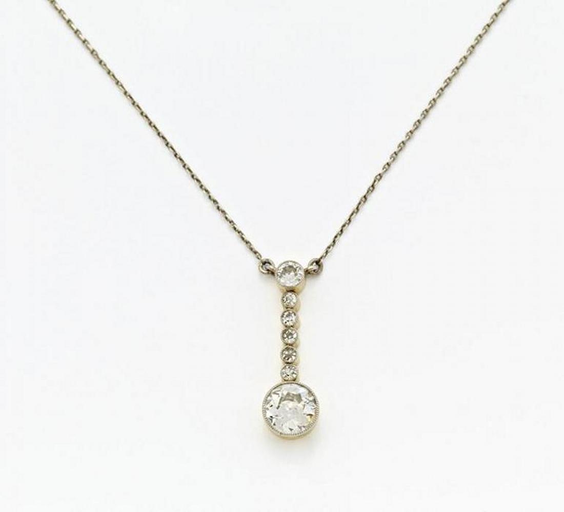 Kette: Silber, Anhänger: 585/- Gelbgold/Platinverbödung, Gewicht: 2,9g. L. 40,0 und 44,0cm. Verstellbar. Anhänger L.ca. 2,3cm. 6 Diamanten im Alt- und 8/8-Schliff zus.ca. 0,276ct, 1 Altschliff-Diamant ca. 1,072ct TCr(I) VS2.