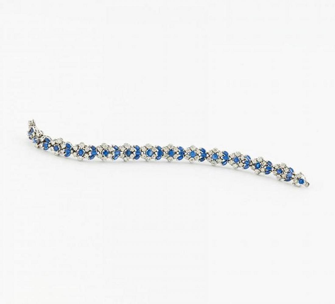 585/- Weißgold, Gewicht: 36,3g. L x B=ca. 18,5 x 1,0cm. 78 Brillanten zus.ca. 6,63ct TW-W(G-H) VVS, 13 rund facettierte Saphire zus.ca. 4,55ct, 36 Saphir-Navettes zus.ca. 4,32ct.