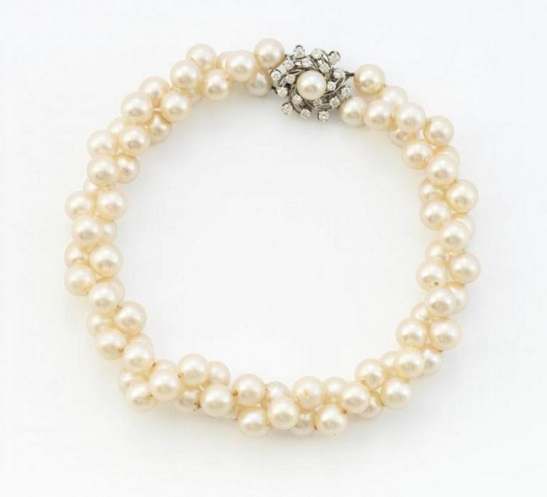 Zierschloss: 750/- Weißgold, Gewicht: 96,2g. L.ca. 40,0cm. 17 Brillanten zus.ca. 1,648ct W(H) VVS-VS, 1 Akoya-Zuchtperle (geklebt), 79 Akoya-Zuchtperlen, D.ca. 9,0mm, weiß-rosé.