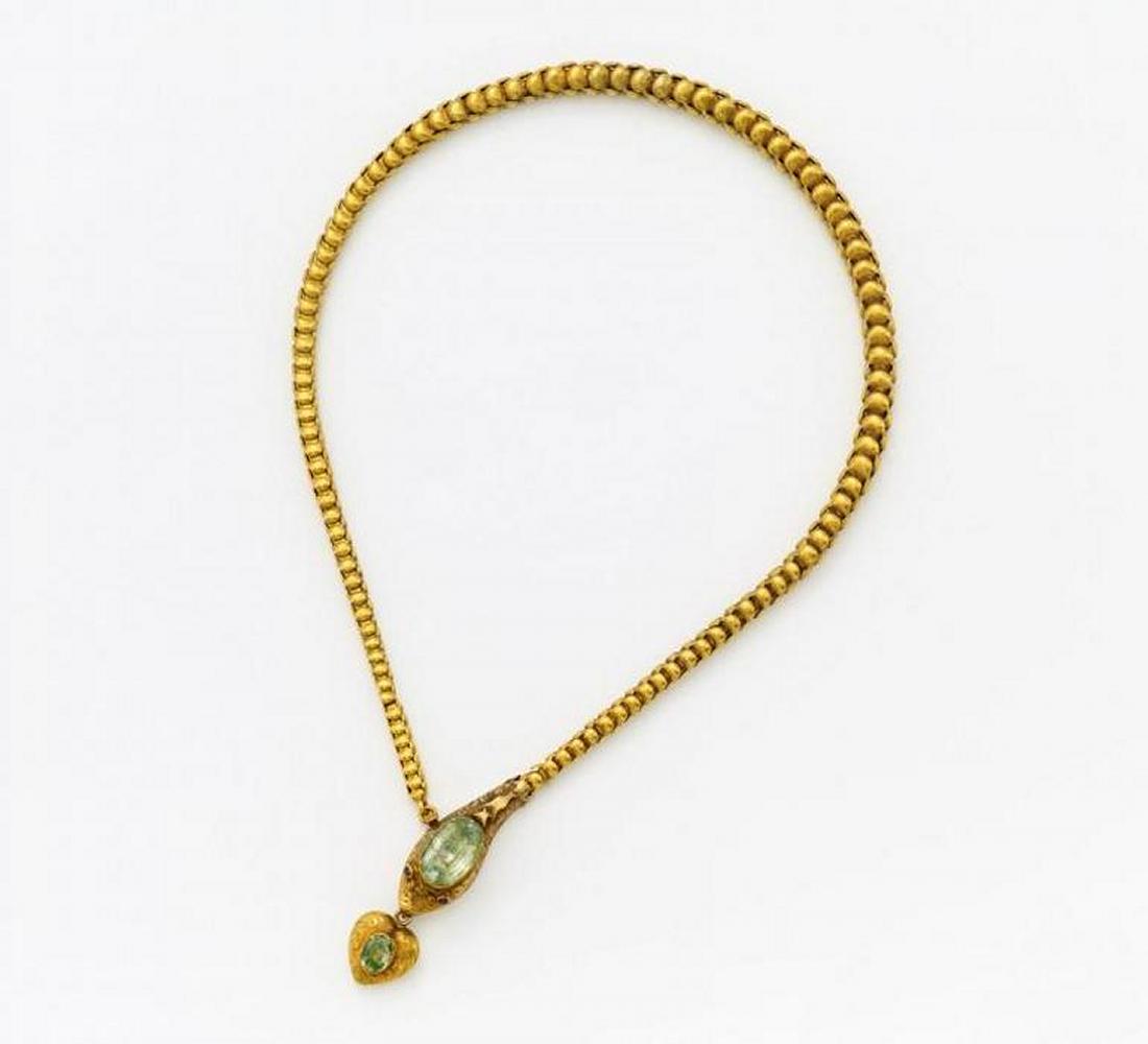 625/- Gelbgold, Gewicht: 23,5g. L.ca. 39,5cm. 2 oval facettierte, grün folierte Spinelle, 2 winzige Amethyste.