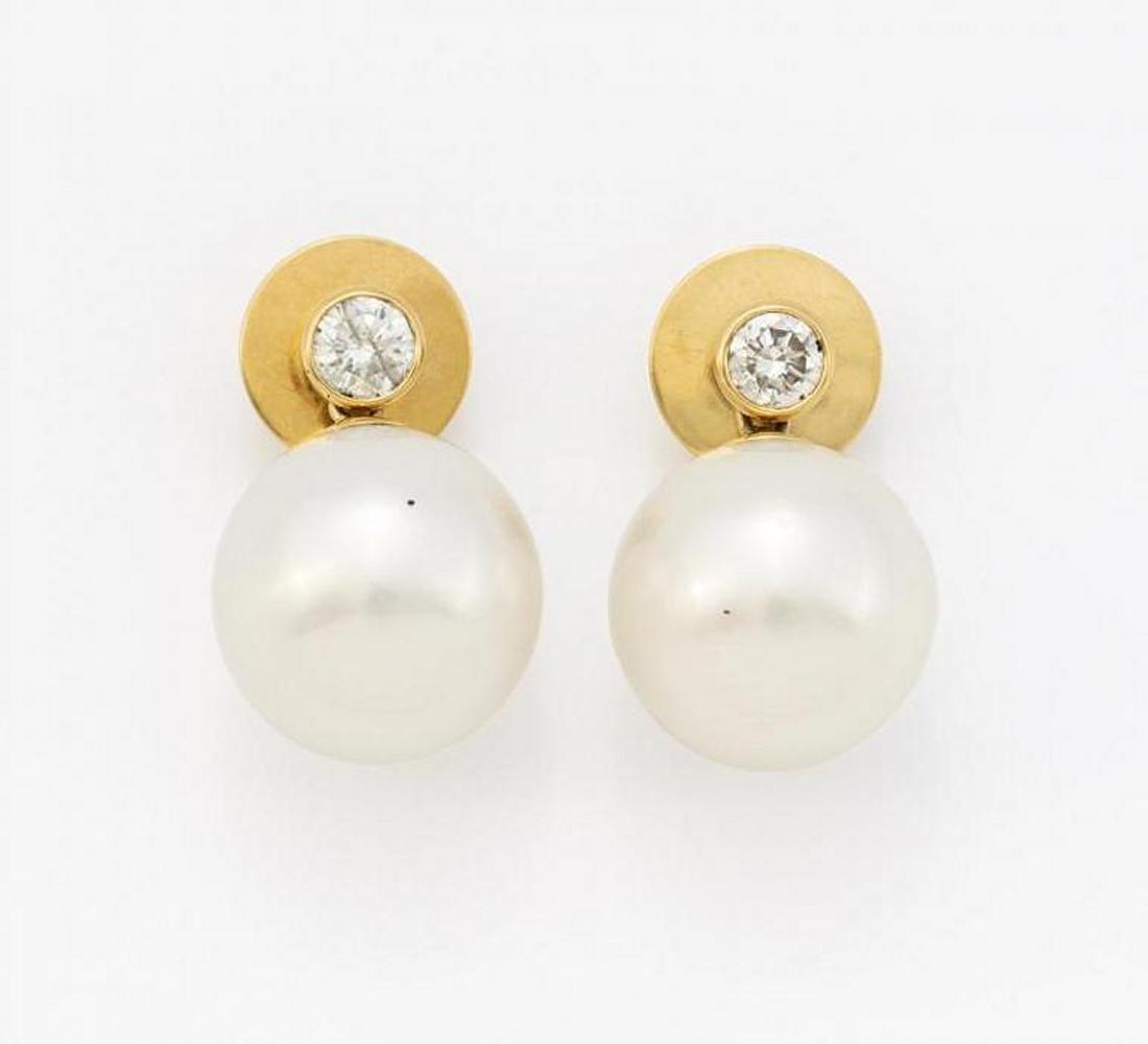 750/- Gelbgold, Gewicht: 10,5g. 2 Brillanten zus.ca. 0,546ct W(H) SI2, 2 Südsee-Zuchtperlen, rund, D.ca. 14,0mm, weiß-silbrig.