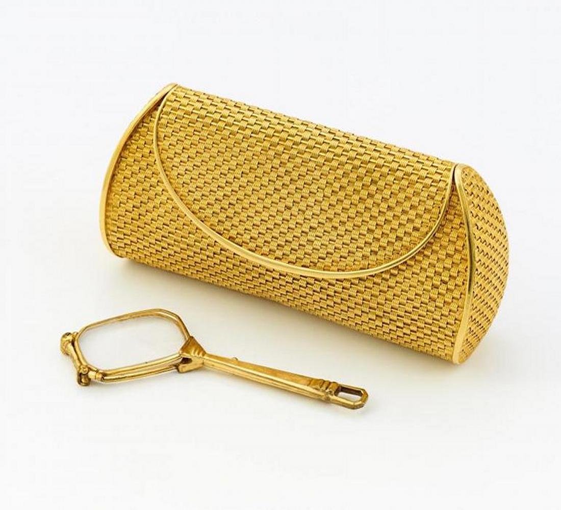 Als Beilage ein Lorgnon aus vergoldetem Metall, in Lederetui.