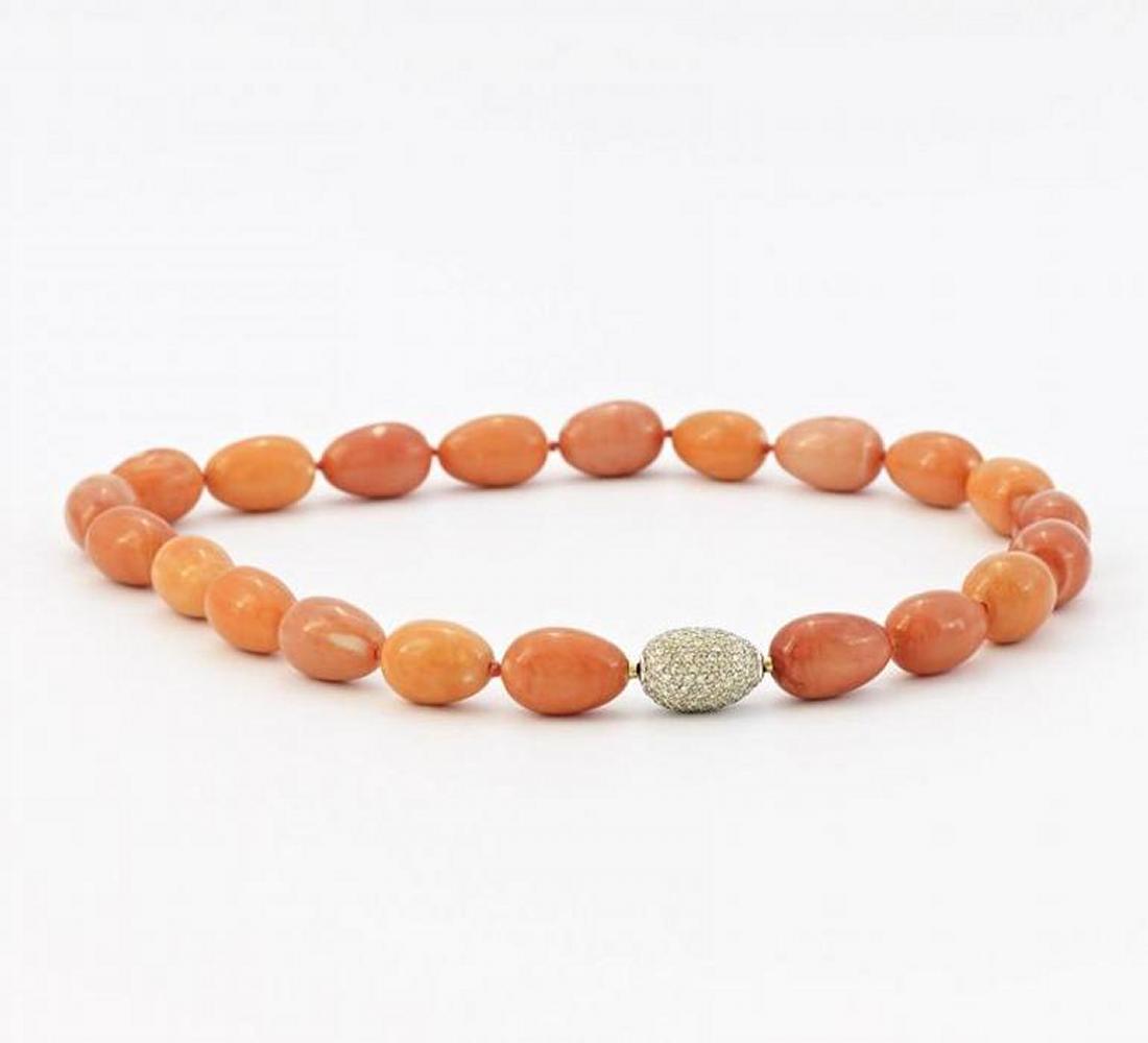 Schließe: 750/- Weißgold, Gewicht: 110,2g. L. 46,5cm. Vielzählige, teils farbige Diamanten zus.ca. 3,35ct VS, 21 apricot-roséfarbene Korall-Pampeln D.ca. 19,7 x 12,9mm, Momo.