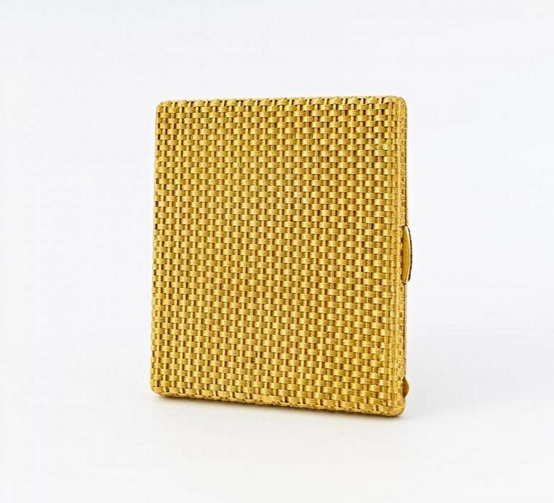 750/- Gelbgold, Gewicht: 159,2g. H x B=ca. 9,2 x 8,0cm. 8 winzige fancy cut, synthetische Saphir-Karrees am Verschluss.