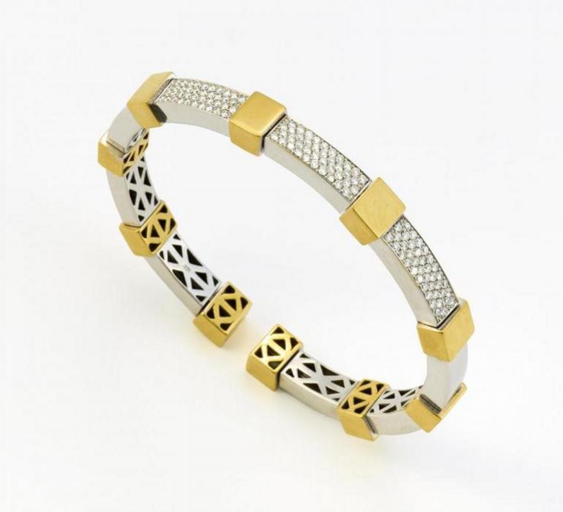 750/- Gelb-/Weißgold, Gewicht: 43,5g. Innendurchmesser ca. 6,0cm, flexibel. Ca. 120 Brillanten zus.ca. 1,40ct W(H) VVS-VS.