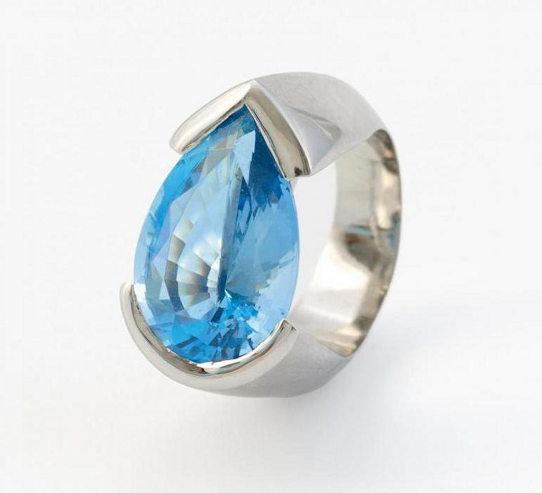 750/- Weißgold, Gewicht: 20,0g. EU-RM: 49. 1 facettierter Aquamarin-Tropfen ca. 8,40ct.