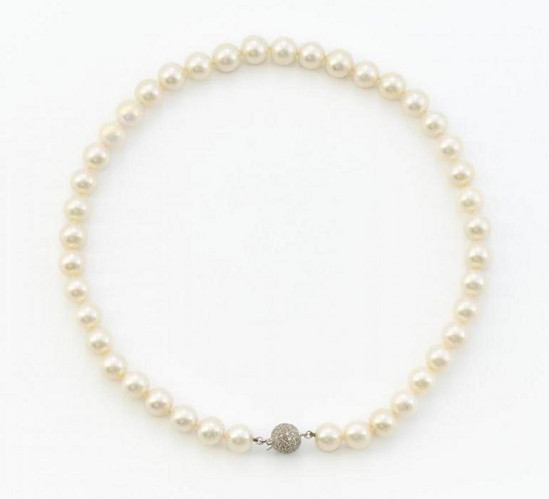 Schließe: 750/- Weißgold, Gewicht: 52,7g. L.ca. 42,5cm. 78 Brillanten zus.ca. 0,75ct W(H) VVS-VS, 40 runde Akoya-Zuchtperlen D.ca. 9,5-10,0mm, weiß-rosé-grünlich.