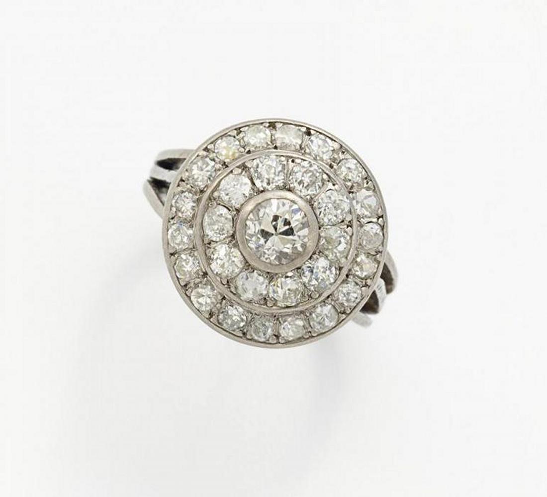 900/- Platin, Gewicht: 6,0g. EU-RM: 49. Ringtop: D.ca. 1,55cm. 30 Diamanten im 8/8- und Altschliff zus.ca. 1,588ct TCr-Cr(I-J) VS-P1.