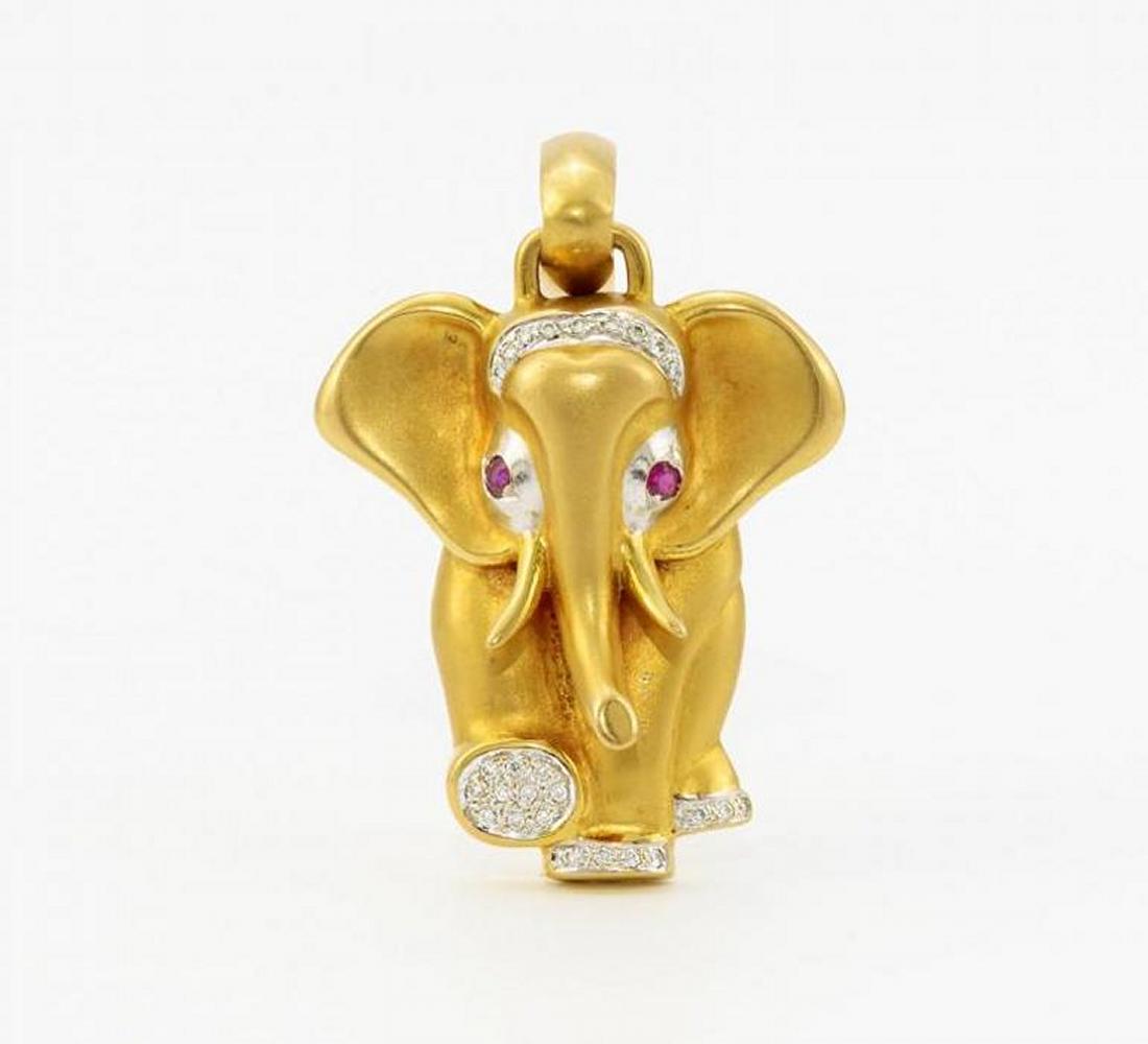 750/- Gelbgold, Gewicht: 30,2g. H x B=ca. 5,4 x 3,5-1,8cm. 26 winzige Brillanten zus.ca. 0,15ct, 2 rund facettierte Rubine zus.ca. 0,14ct.