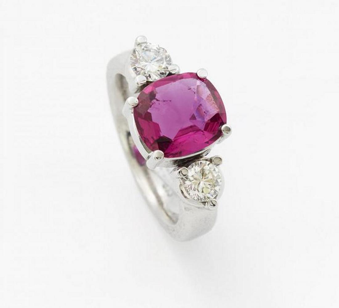 585/- Weißgold, Gewicht: 8,5g. EU-RM: 56. 2 Brillanten zus.ca. 0,733ct W(H) VVS, 1 rosa-pinkfarbener Saphir im Ceylonschliff ca. 3,25ct.