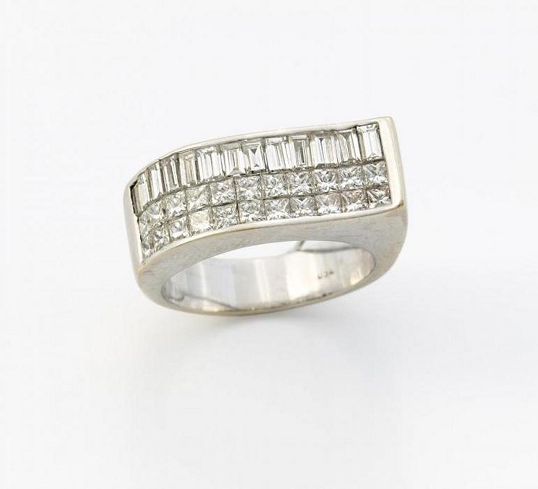 750/- Weißgold, Gewicht: 10,0g. EU-RM: 53. Ringtop: H x B=ca. 0,8 x 2,1cm. 35 Diamanten im Princess Cut und Baguetteschliff zus.ca. 2,86ct W(H) VVS2.