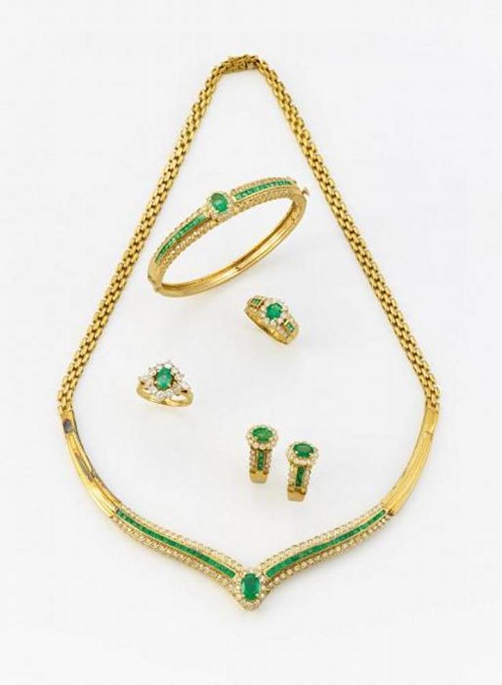750/- Gelbgold, Gewicht: Total: 107,2g. EU-RM: 52, 53. Armreif Innendurchmesser ca. 5,4cm, Ohrsteckclips: H x B=ca. 2,0 x 1,0cm, Collier L.ca. 49,0cm. 195 Brillanten und 6 Diamant-Navettes zus.ca. 5,34ct W(H) VVS-VS, 6 oval facettierte Smaragde, 70 facettierte Smaragd-Karrees zus.ca. 12,59ct.