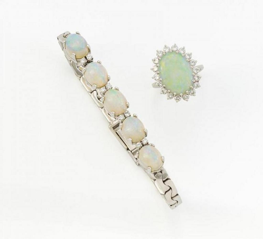 585/- Weißgold, Gewicht: 25,2g. EU-RM: 52. Armband L.ca. 18,2cm. 25 Brillanten zus.ca. 0,772ct W(H) VS, 1 weißer Opal-Cabochon ca. 3,34ct, 5 weiße Opal-Cabochons zus.ca. 8,05ct.
