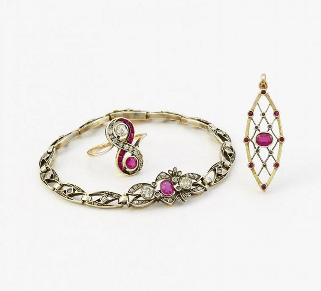 Armband: 56 Zolotnik ca. 585/- Roségold/Silberverbödung, Anhänger: 56 Zolotnik ca. 585/- Rosé-/Gelbgold/Silberverbödung, Ring: 750/- Gelbgold, Punze, Gewicht: 13,1g; 3,4g; 3,5g. EU-RM: 58. Armband L.ca. 19,0cm. Armband: 41 Diamantrosen, 2 Altschliff-Diamanten zus.ca. 0,592ct Cr(J) SI, 1 oval facettierter Rubin ca. 0,51ct.