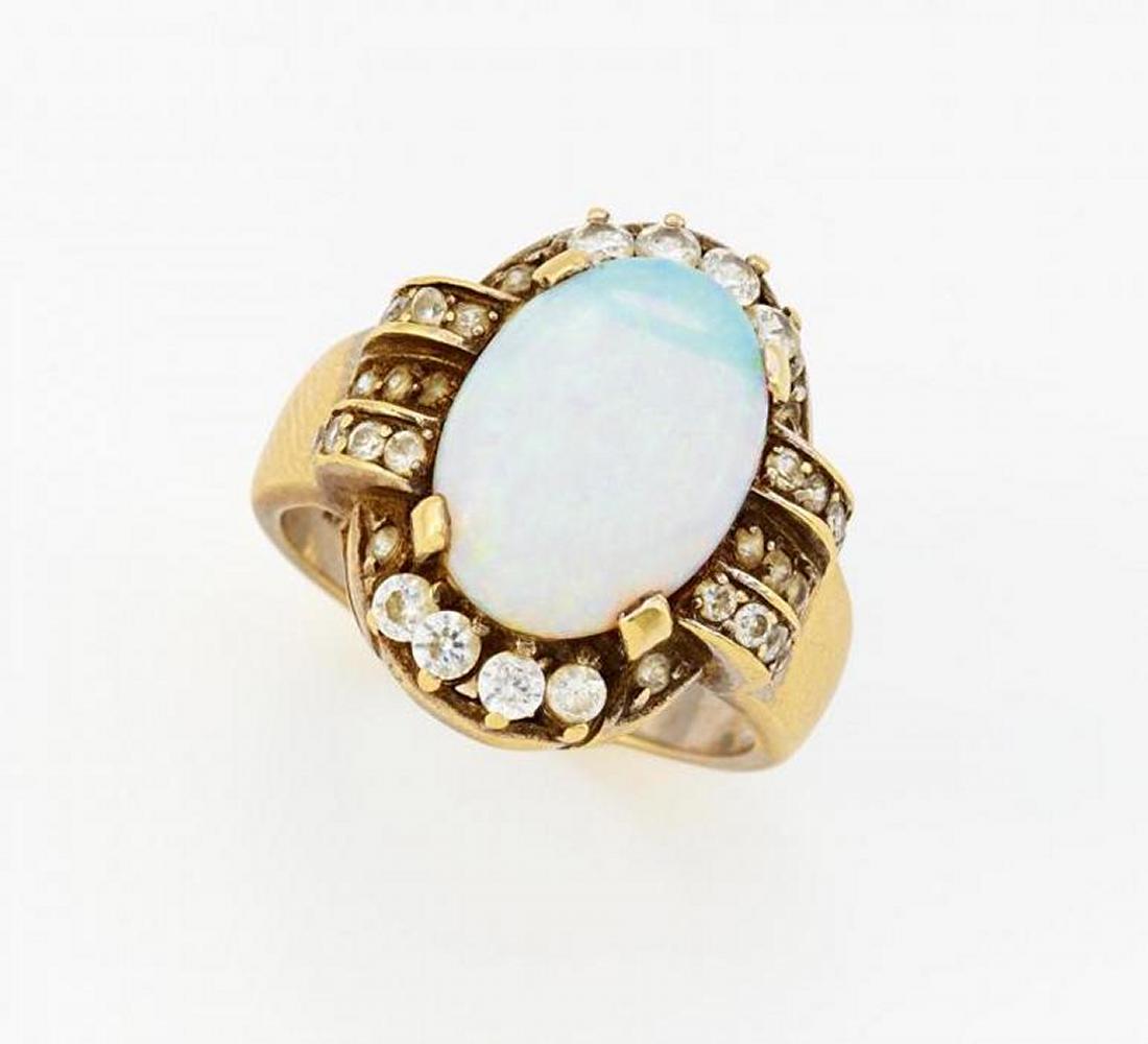 585/- Weißgold, Gelbgoldverbödung, Gewicht: 6,7g. EU-RM: 54. 32 Diamanten im 8/8- und Brillantschliff zus.ca. 0,288ct, 1 weißer Opal-Cabochon ca. 2,06ct.