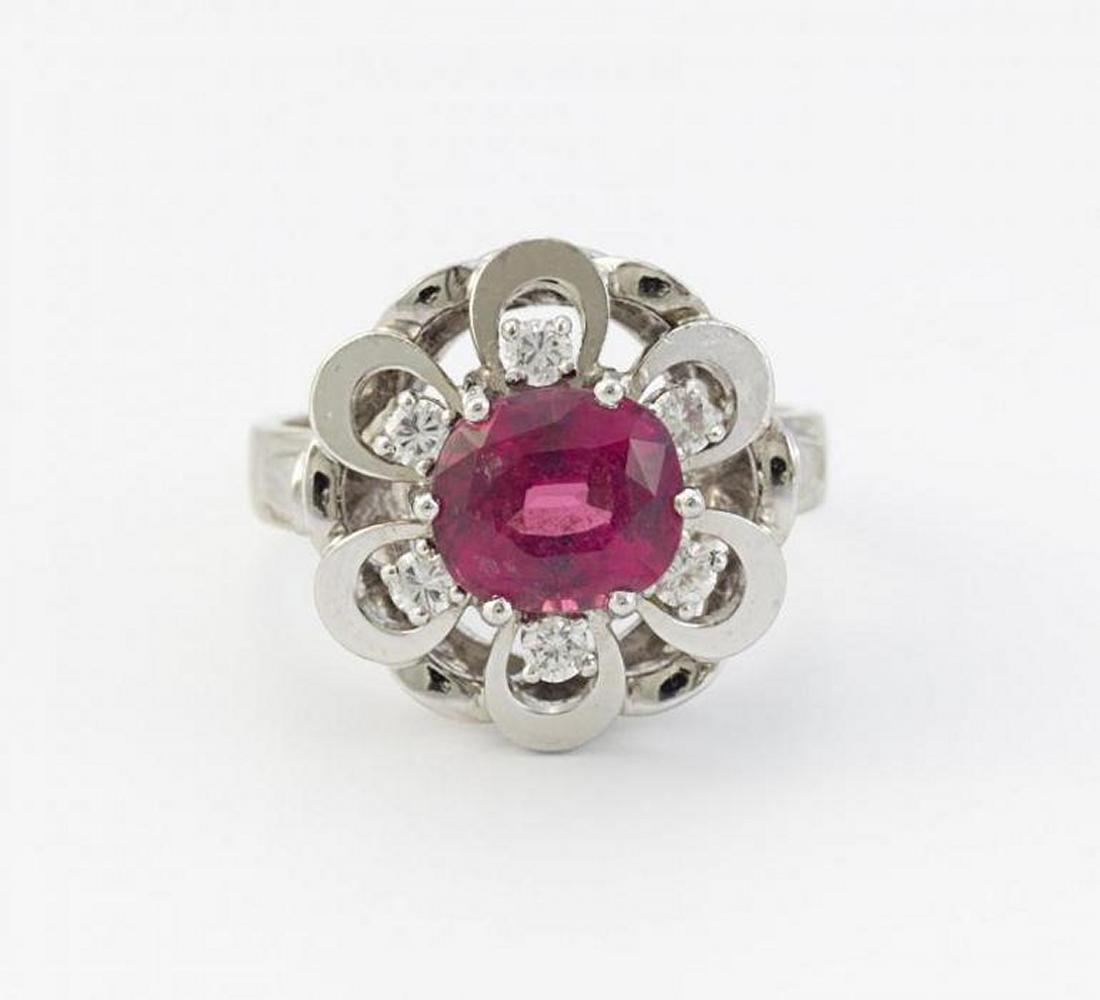 585/- Weißgold, Gewicht: 6,2g. EU-RM: 51,5. Ringtop: D.ca. 1,6 x 1,4cm. 6 winzige Brillanten zus.ca. 0,21ct, 1 facettierter Pyrop (Granat-Gruppe) im Antikschliff ca. 2,07ct.