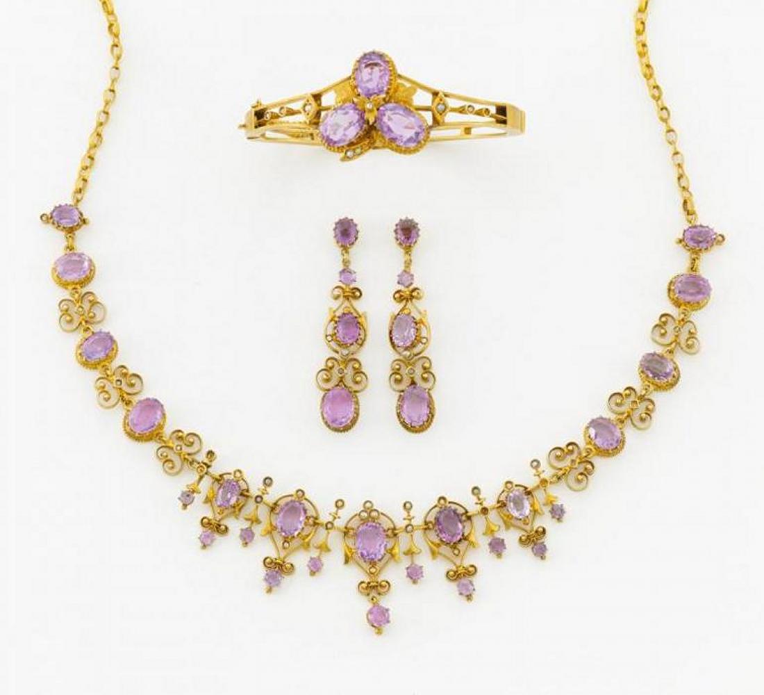 333/- Gelbgold, Armspange: 585/- Gelbgold, Punze, Gewicht: 54,0g. L.ca. 55,0cm, Ohrgehänge: L.ca. 5,0cm, Armspange Innendurchmesser ca.5,7cm. 22 oval facettierte Amethyste D.ca. 6,25x5,55mm - 11,25x8,45mm, 34 Saatperlen (einzelne fehlend).