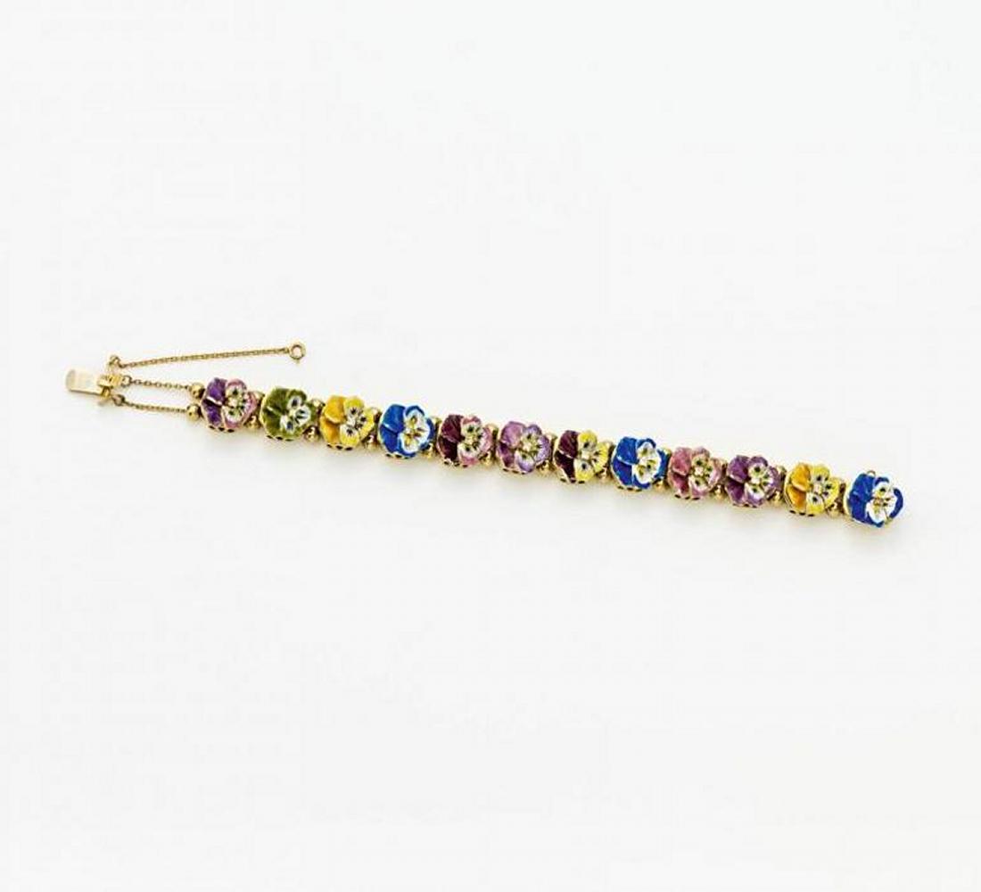 Wunderschönes Armband mit fein emaillierten Stiefmütterchen. Rückseitig jedes Element 14