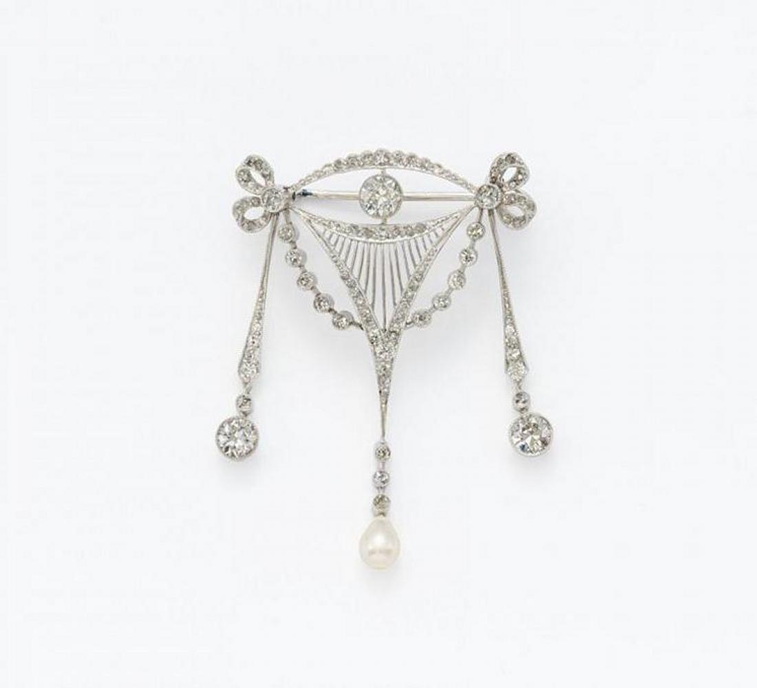 900/- Platin, Meistermarke und Punze verschlagen, Gewicht: 8,0g. H x B=ca. 4,3 x 3,1cm. Ca. 68 Diamanten im Alt- und Rosenschliff zus.ca. 1,102ct TCr-Cr(I-J) VS-SI2, 1 wohl Naturperl-Tropfen, weiß.