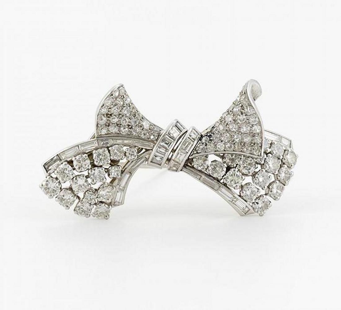 750/- Gelbgold, Platinverbödung, Gewicht: 15,7g. H x B=ca. 2,4 x 4,7cm. 28 Brillanten, 27 Diamant-Baguettes/-Karrees und 47 Altschliff-Diamanten zus.ca. 2,822ct W(H) VVS.