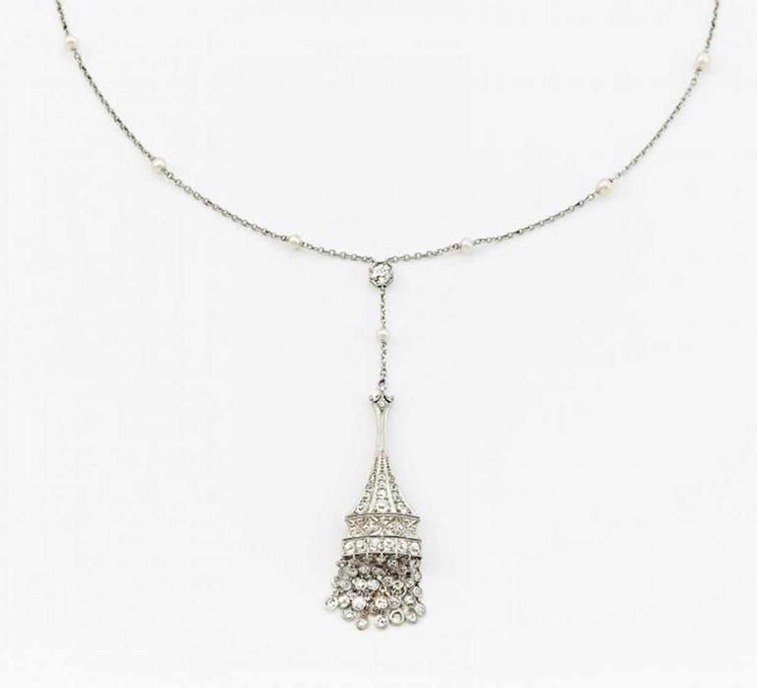 750/- Weißgold, teils Platinverbödung, Gewicht: 16,7g. Kette L.ca. 110,0cm, Anhänger: ca- 4,5 x 1,6cm. Ca. 92 Diamanten im Alt- und Rosenschliff zus.ca. 3,864ct TCr-TCape(I-K) VS-SI, 16 vemutl. Naturperlen, rund-unrund, D.ca. 3,12mm, weiß.