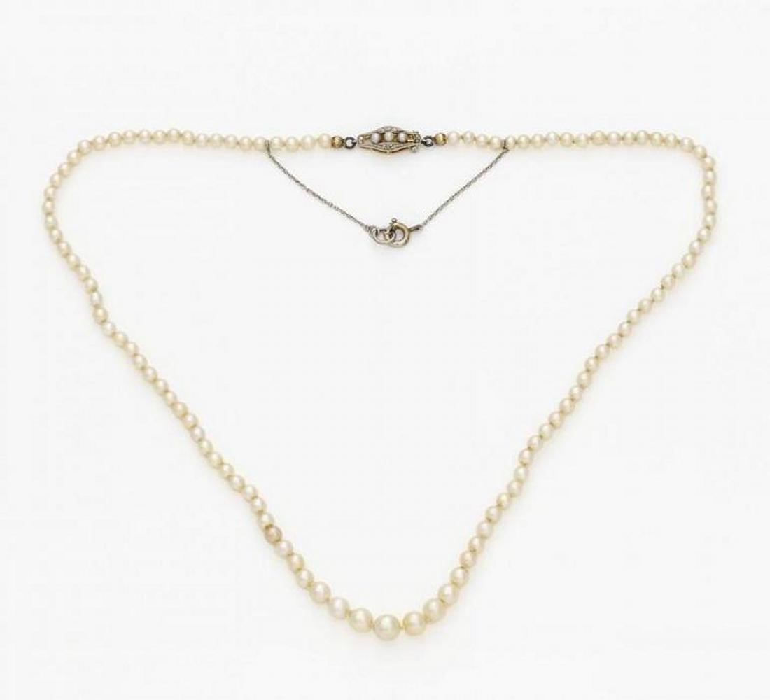 Zierverschluss: 585/- Gelbgold, Silberverbödung; Sicherheitskettchen Silber (nachträglich), Gewicht: 9,6g. L.ca. 45,0cm. 108 vermutl. Naturperlen (geknotet), rund, D.ca. 3,29-5,93mm, weiß-creme-leicht rosé. 3 winzige Saatperlen am Zierverschluss.