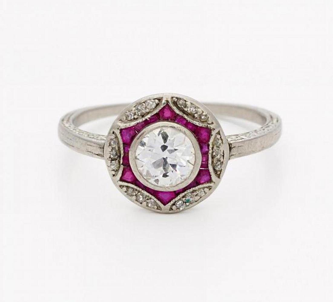 900/- Platin, Gewicht: 3,1g. EU-RM: 51. 1 Altschliff-Diamant ca. 0,442ct TCr(I) VVS2, 18 winzige 8/8-Diamanten, 18 fancy cut, synthetische Rubine.