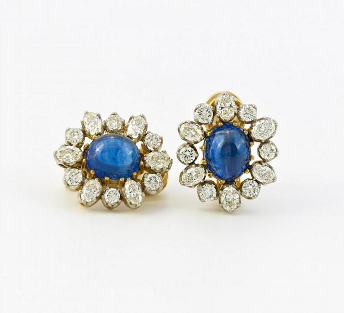 750/- Gelbgold, Platinverbödung; Wiener Amtspunze 1967-2001, Gewicht: 20,3g. D.ca. 2,4 x 2,1cm. 12 Brillanten zus.ca. 2,0ct, 12 oval facettierte Diamanten zus.ca. 3,0ct W(H), VS-SI, 2 ovale Saphir-Cabochons zus.ca. 19,0ct