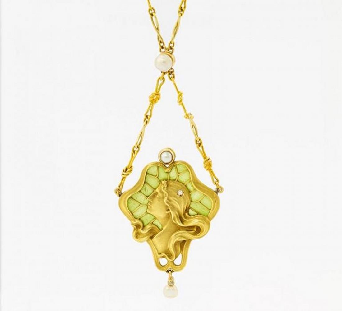 585/- Gelbgold, grünes Fensteremail, Gewicht: 18,2g. L. 57,5cm. 2 winzige Altschliff-Diamanten, 3 barocke, wohl Naturperlen.