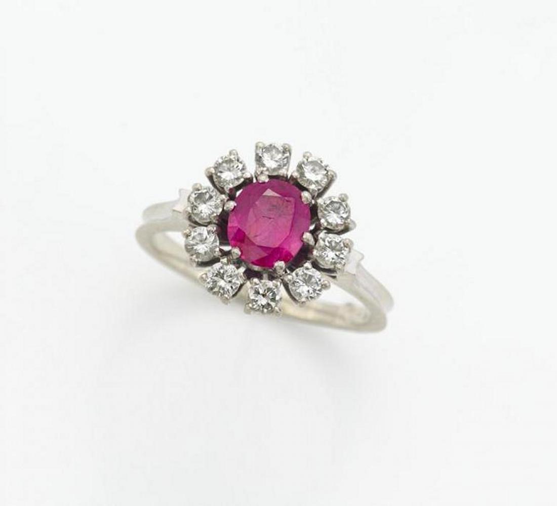 750/- Weißgold, Gewicht: 3,9g. EU-RM: 53. 10 Brillanten zus.ca. 0,50ct W(H) VVS, 1 oval facettierter Rubin ca. 1,16ct.