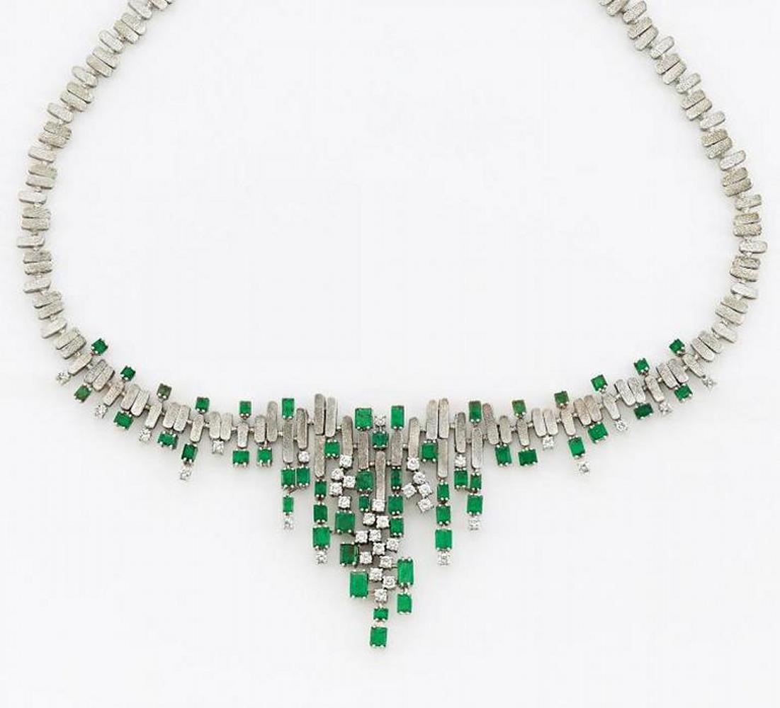 750/- Weißgold, Gewicht: 63,2g. L x B=ca. 44,5 x 5,2-0,6cm. 38 Brillanten zus.ca. 1,71ct W(H) VVS, 51 facettierte Smaragde im Baguette-/Karreeschliff zus.ca. 6,828ct.