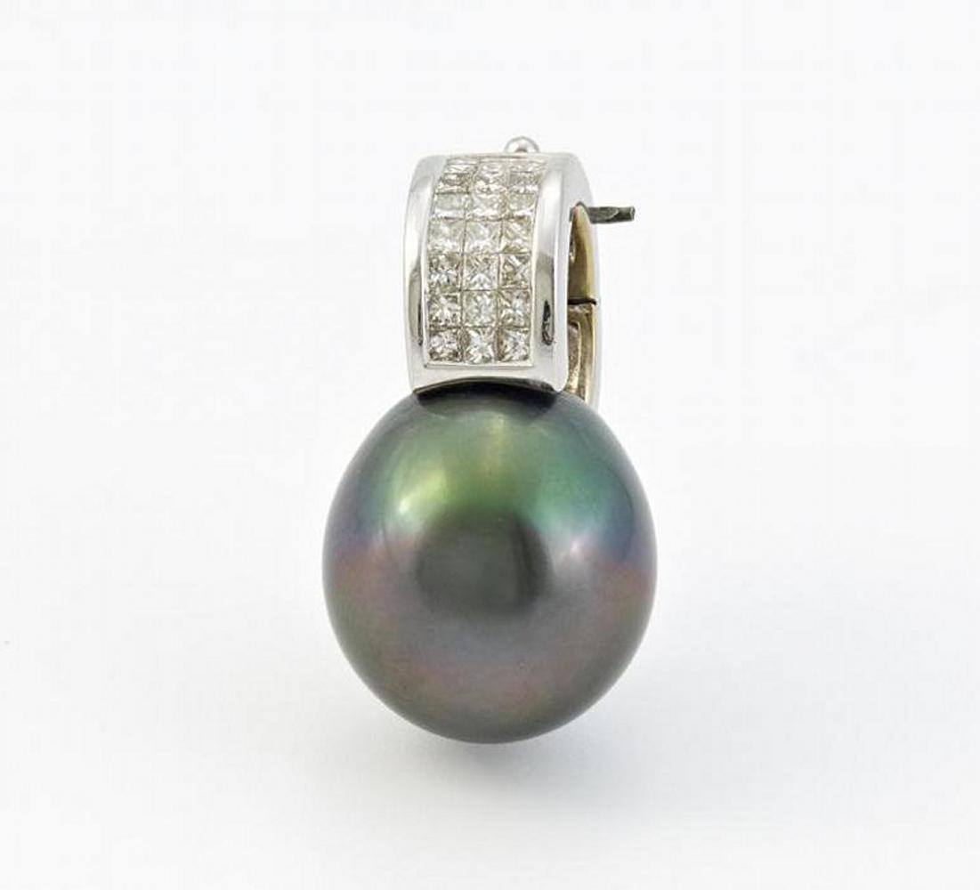 750/- Weißgold, Gewicht: 6,8g. H x B=ca. 2,2 x 1,3-0,7cm. 24 Diamanten im Princess-Cut zus.ca. 0,24ct, 1 Tahiti-Zuchtperle, anthrazit-grün, D.ca. 14,10 x 13,0mm.
