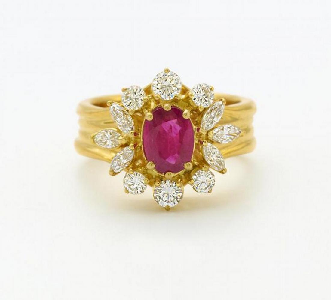 750/- Gelbgold, Gewicht: 10,0g. EU-RM: 50. 6 Brillanten und 6 Diamant-Navettes zus.ca. 0,492ct W(H) VVS, 1 oval facettierter Rubin ca. 0,93ct.