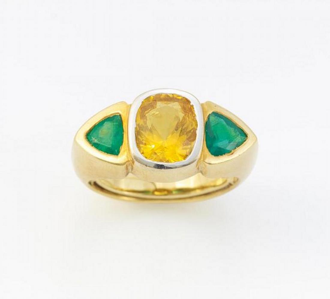 750/- Gelb-/Weißgold, Gewicht: 18,0g. EU-RM: 61. Ringtop: H x B=ca. 1,2 x 2,5cm. 1 facettierter, gelber Saphir im Cushion Cut ca. 5,55ct, 2 facettierte Smaragd-Triangel zus.ca. 1,34ct.