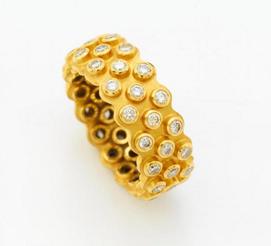 750/- Gelbgold, Gewicht: 8,0g. EU-RM: 51. Ringbreite: ca. 0,8cm. 48 Brillanten zus.ca. 0,576ct.