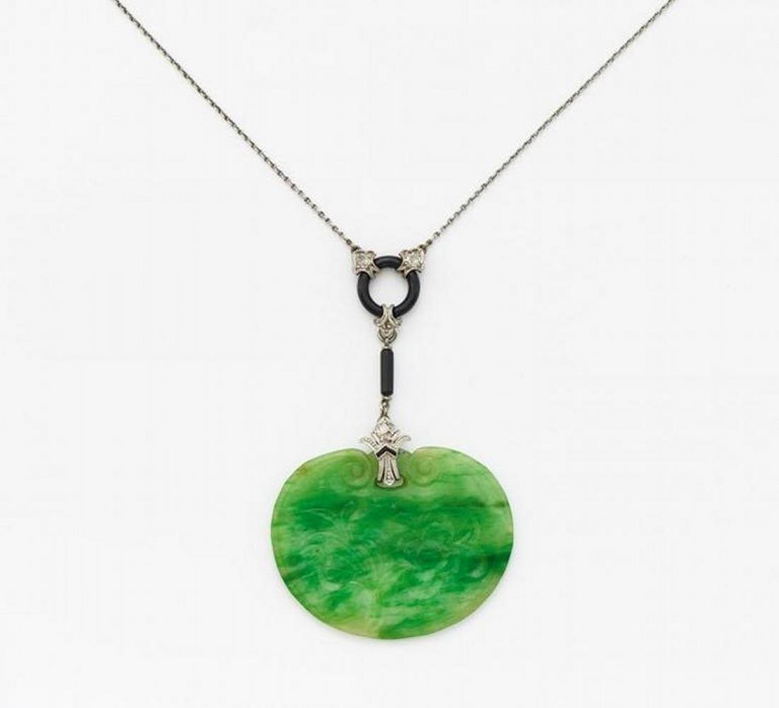 750/- Weißgold, Gewicht: 14,5g. L.ca. 70,5cm. 3 Altschliff-Diamanten zus.ca. 0,208ct Cape(S-Z) P1, 1 Onyx-Stab, 1 Onyx-Ring, 1 handgravierte Jadeit-Platte D.ca. 3,5 x 4,4cm.