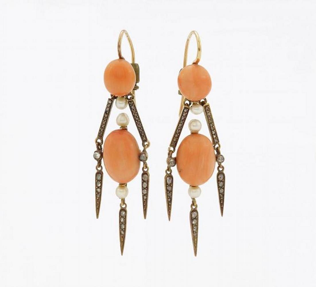 585/- Roségold, Gewicht: 13,0g. L.ca. 6,0cm. 70 winzige Diamantrosen, 4 Korall-Cabochons D.ca. 9,48 x 9,24mm, 13,82 x 10,48mm, 6 Süßwasser-Zuchtperlen.