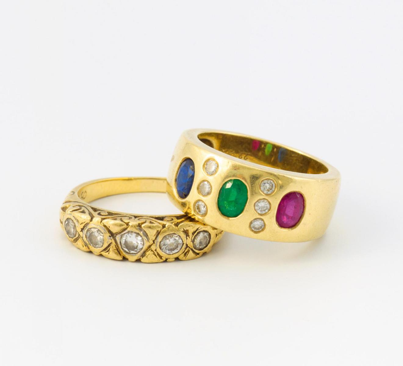 585/- Gelbgold, gestempelt (teils verschlagen), Gewicht: 15,5g. EU-RM: 54, 55,5. 11 Brillanten, 1 oval facettierter Rubin/Smaragd und Saphir.
