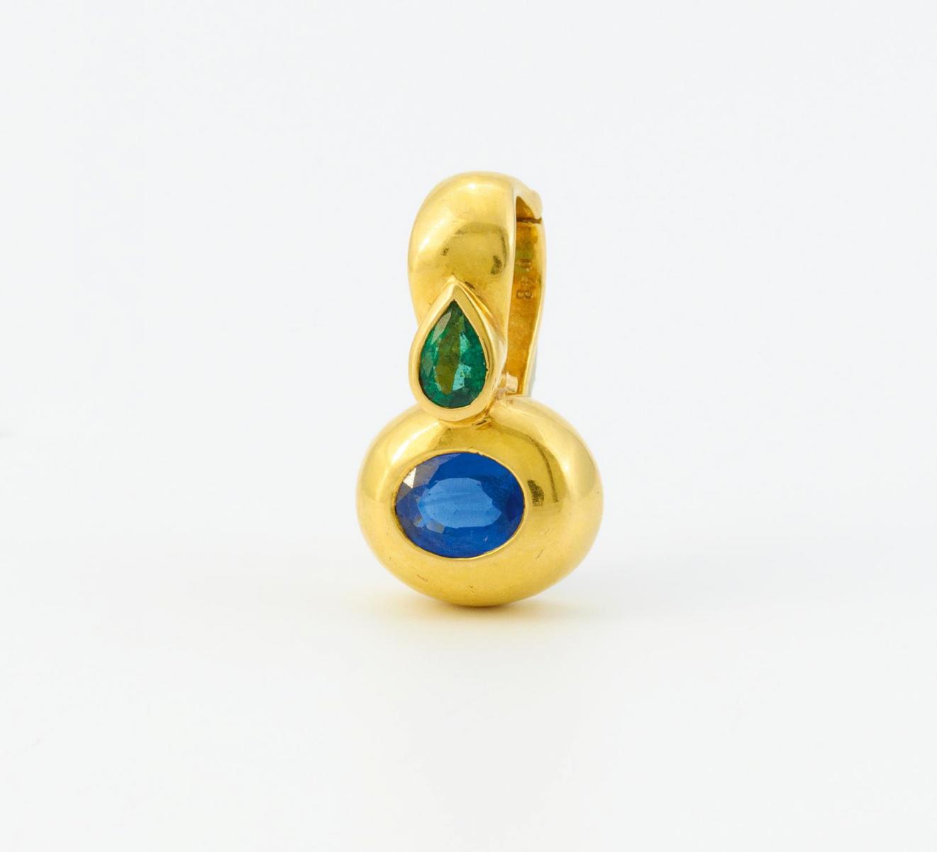 750/- Gelbgold, gestempelt, Gewicht: 8,0g. H.ca. 2,4cm. 1 facettierter Smaragd-Tropfen, 1 oval facettierter Saphir.