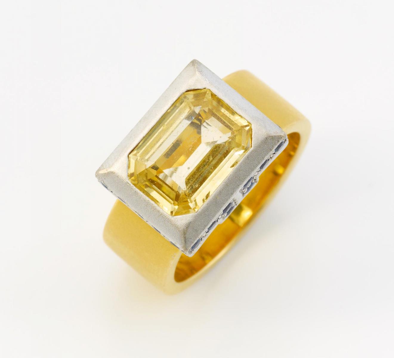 750/- Gelb-/Weißgold, gestempelt, Gewicht: 27,0g. EU-RM: 62,5. 1 gelber Saphir im Emerald Cut, 26 rund facettierte, blaue Saphire.