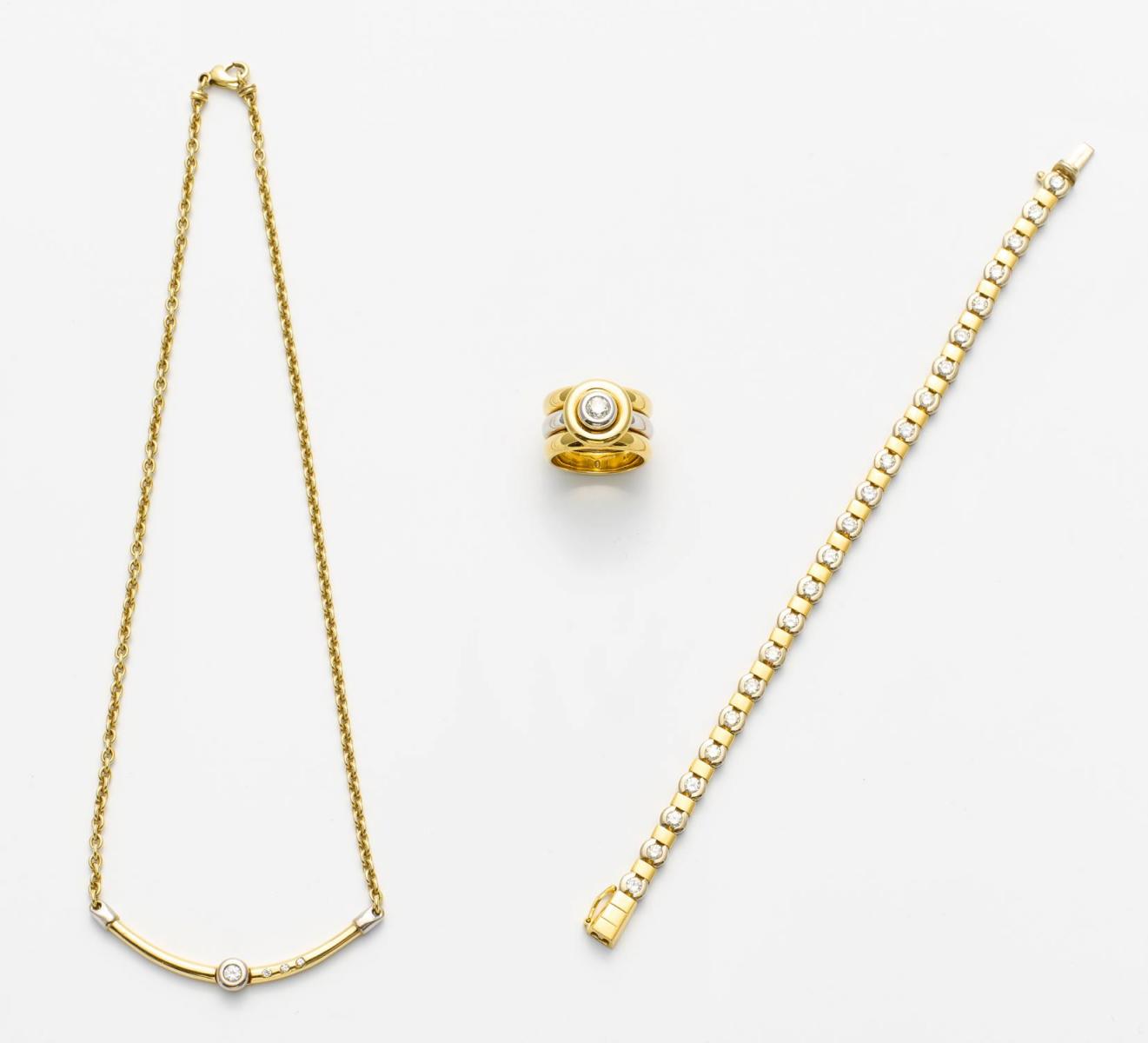 Collier+Ring: 585/- Gelb-/Weißgold, gest.; A.band: 750/- Gelb-/Weißgold, gest, Gewicht: 1. 37,5g; 2. 25,0g. EU-RM: 55. Collier L.ca. 42,0cm, A.band L.ca. 18,8cm. 28 Brillanten.