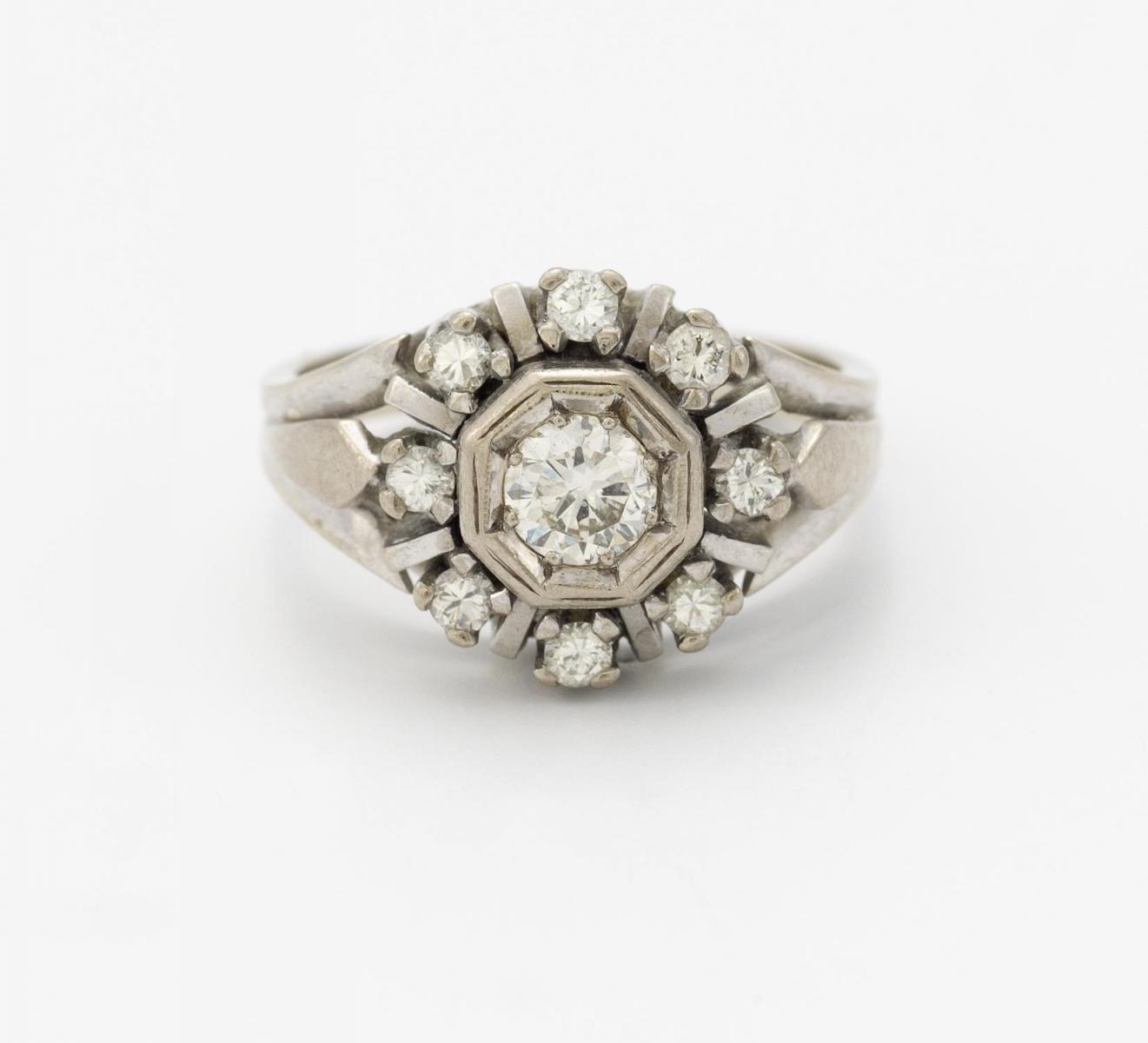 585/- Weißgold, gestempelt, Gewicht: 7,33g. EU-RM: 56. 9 Brillanten.